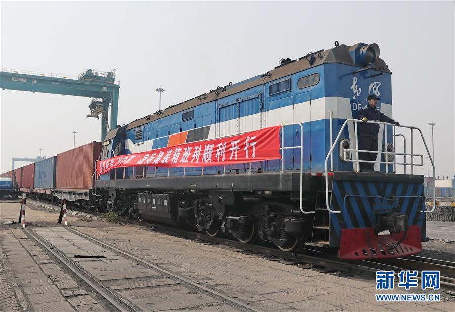 4月18日,由秦皇岛港发往蒙古国乌兰巴托市的国际集装箱班列从秦皇岛港驶出。(图片来源:新华社 杨世尧摄)
