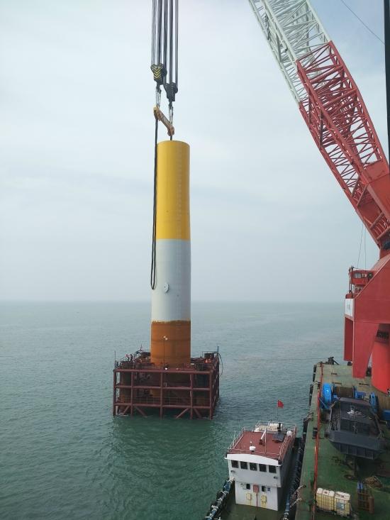 三峡新能源江苏大丰300MW海上风电项目离岸直线距离约45km,泥面高程在-1.0m~-17.0m之间,风电场共安装54台3.3MW和19台6.45MW风电机组,总装机规模300MW,其中6.45MW单桩基础直径最大8m,桩重最大约1153t,桩长最长87m。