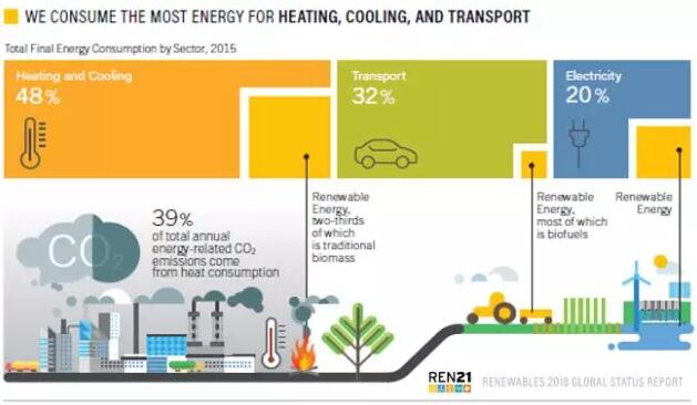 可再生能源在供热和制冷领域的变化不大: 2015年,现代可再生能源为全球供暖体系提供了10% 左右的总热量。相比于146个国家在电力行业制定了可再生能源目标,世界上只有48个国家制定了供热和制冷领域的可再生能源国家目标。一些小变化正在发生。例如与2016年相比,2017年印度太阳能集热器的安装量增加了约25%。中国的目标是到2020年太阳能热能提供2%的建筑制冷。