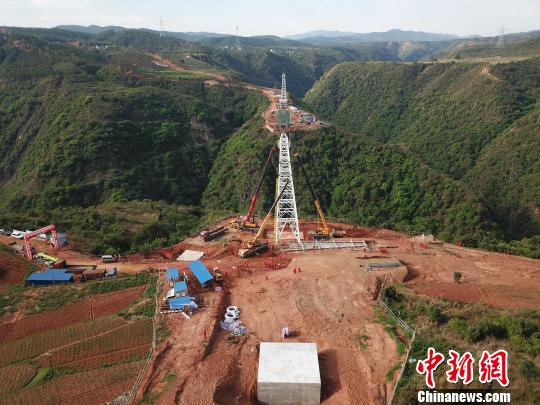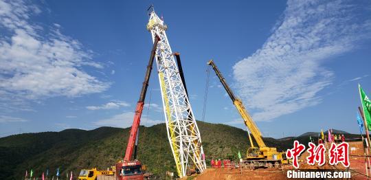 勐岗河悬索跨越北岸塔架吊装作业现场。华昱翔摄