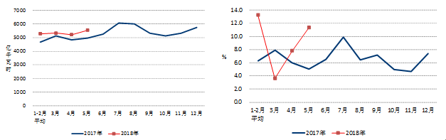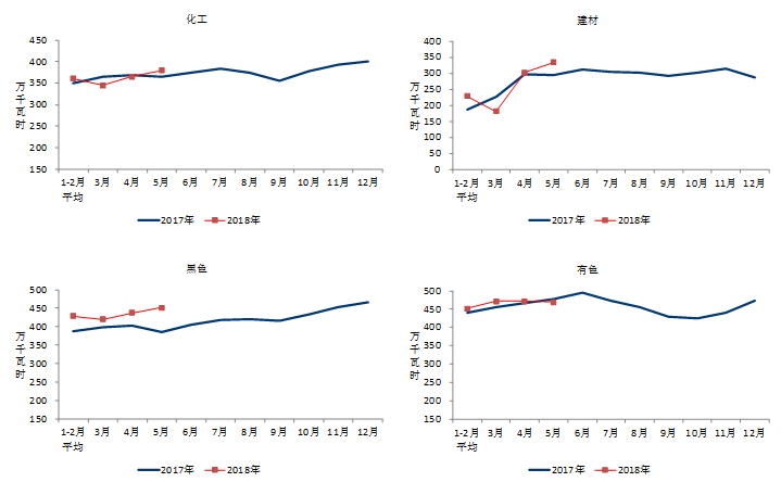 5月份,四大高载能行业用电量合计1633亿千瓦时,同比增长8.6%,占全社会用电量的比重为29.5%。其中,化工行业用电量379亿千瓦时,同比增长6.7%;建材行业用电量334亿千瓦时,同比增长14.6%;黑色金属行业用电量452亿千瓦时,同比增长18.6%;有色金属冶炼行业469亿千瓦时,同比下降1.6%。