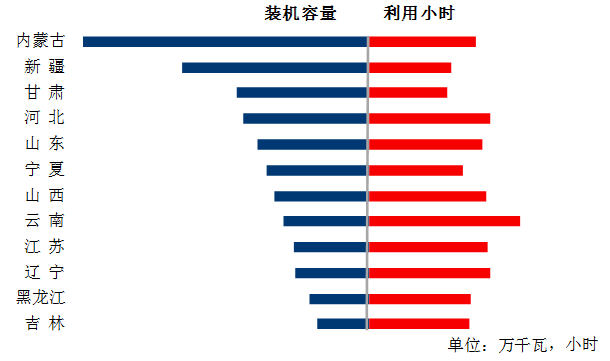 图5 1-5月份风电装机较多省份风电装机容量和设备利用小时