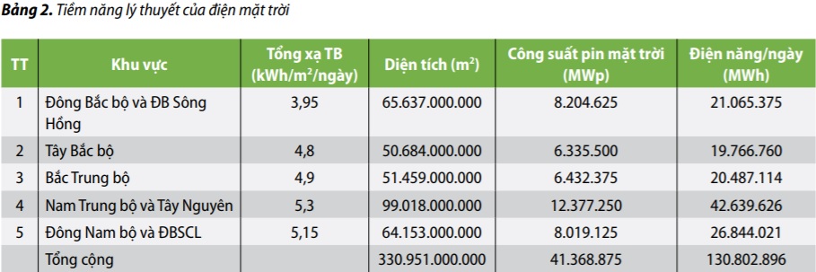 越南是一个年度太阳辐射量大而稳定的地区,特别是在中部高地,中部海岸和南部以及湄公河三角洲地区。平均而言,太阳辐射为每天4-5kW / ㎡。根据评估,每小时1800小时阳光充足的地区被认为有潜力开发。对越南而言,这一标准适用于许多地区,特别是南方省份。越南太阳能的理论潜力估计如下: