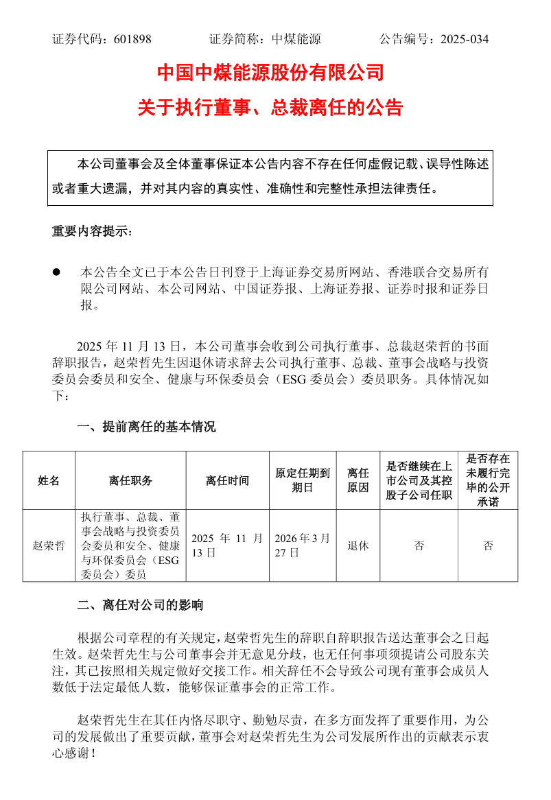 11月14日,中煤能源发布公告称,11月13日,公司董事会收到公司执行董事、总裁赵荣哲的书面辞职报告,赵荣哲先生因退休请求辞去公司执行董事、总裁、董事会战略与投资委员会委员和安全、健康与环保委员会(ESG委员会)委员职务。