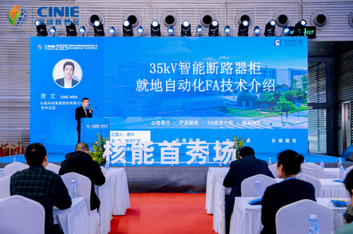 本届核博会特设“核能首秀场”活动,为核能行业新成果、新技术提供展示平台。长缆科技电气子公司发表“35kV 智能断路器柜就地自动化 FA 技术”的专题演讲,围绕技术原理、核心优势、应用场景及实践成效展开深入分享。该项技术能有效强化新能源电力系统及电力网络的供电稳定性,提升运维效率。