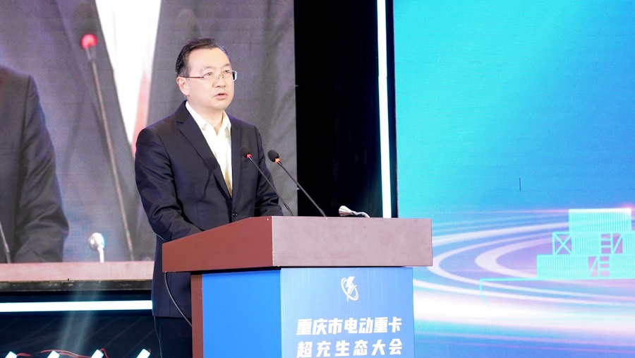 重庆市经济和信息化委员会党组成员、副主任涂兴永在致辞中表示,重庆正在全力打造具有国际竞争力的智能网联新能源汽车之都,重卡商用车是重要组成部分。今年1—10月,全市商用车产量42.3万辆,占全国商用车产量的14.1%。目前,全市营运货车保有量约22万辆,其中重卡12万辆,电动重卡约2700辆。为解决电动重卡“续航焦虑”,重庆市经济和信息化委员会作为行业主管部门正在从3个方面加力推动电动重卡超充生态发展。