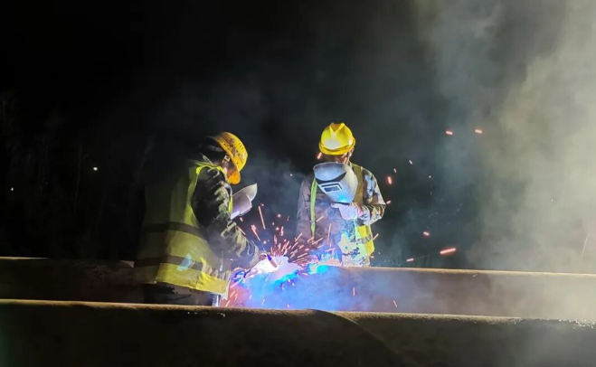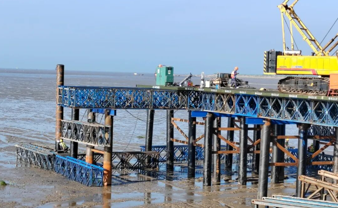 面对潮间带施工困难的情况,林洋新能源建设团队将先筑台、后建站定为首要任务。根据施工规划,两座6400平方米的贝雷结构平台需在1个月内建成,项目组实行设计、施工、监测三班倒机制:技术组白天驻守现场优化钢管桩打入角度,夜晚核算贝雷架承重数据;施工队分成打桩、焊接、防腐三个班组交叉作业,在每日两次潮水退去的间隙抢工。在团队的齐心协作下,直径0.63米的钢管桩群稳稳扎入滩涂,连接平台与海堤的钢栈桥同步贯通,为后续近9万根预制桩、百万块组件的运输安装奠定基础。