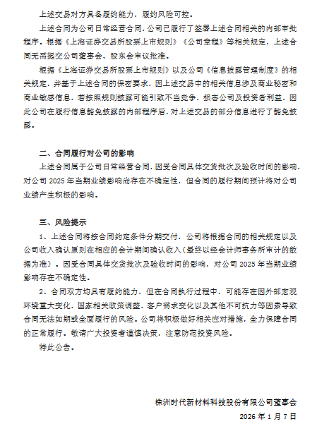 根据公告显示,时代新材2025年10月1日—2025年12月31日与风电各大主机厂签订《叶片销售合同》,时代新材向各大厂商销售风力发电叶片及相关服务,合同金额总计约合人民币33.2亿元(含税价),其中海上风电项目合同金额1.9亿元,陆上风电项目合同金额33.2亿元。