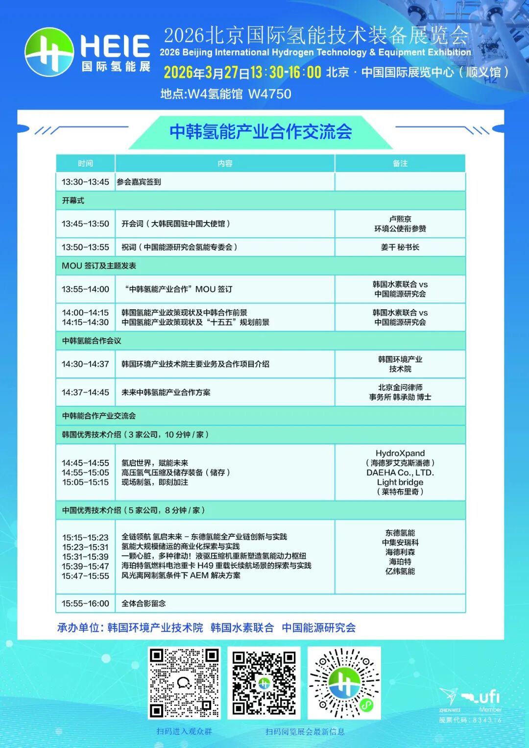 作为HEIE2026同期活动的重要组成部分,一场聚焦东亚氢能产业协同发展的高端对话——“中韩氢能产业合作交流会” 将在3月27日、于北京·中国国际展览中心(顺义馆)W4氢能馆W4750举行。本次会议由韩国环境产业技术院、韩国水素联合与中国能源研究会共同承办,旨在为两国产业界搭建一个务实、高效的对接平台,共同解读政策趋势、分享技术成果、探索商业机遇。