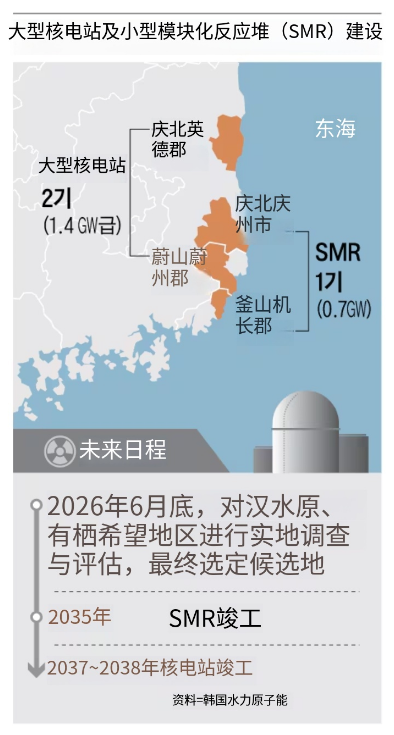 KHNP计划6月前完成基础调查、现场考察和外部专家委员会评估,随后进行最终选址。选址评估采用100分制,选址适宜性、环境影响、施工可行性和公众接受度各占25分。小型模块化反应堆(SMR)目标2035年投入商业运营,两座大型反应堆目标投入时间为2037 - 2038年。