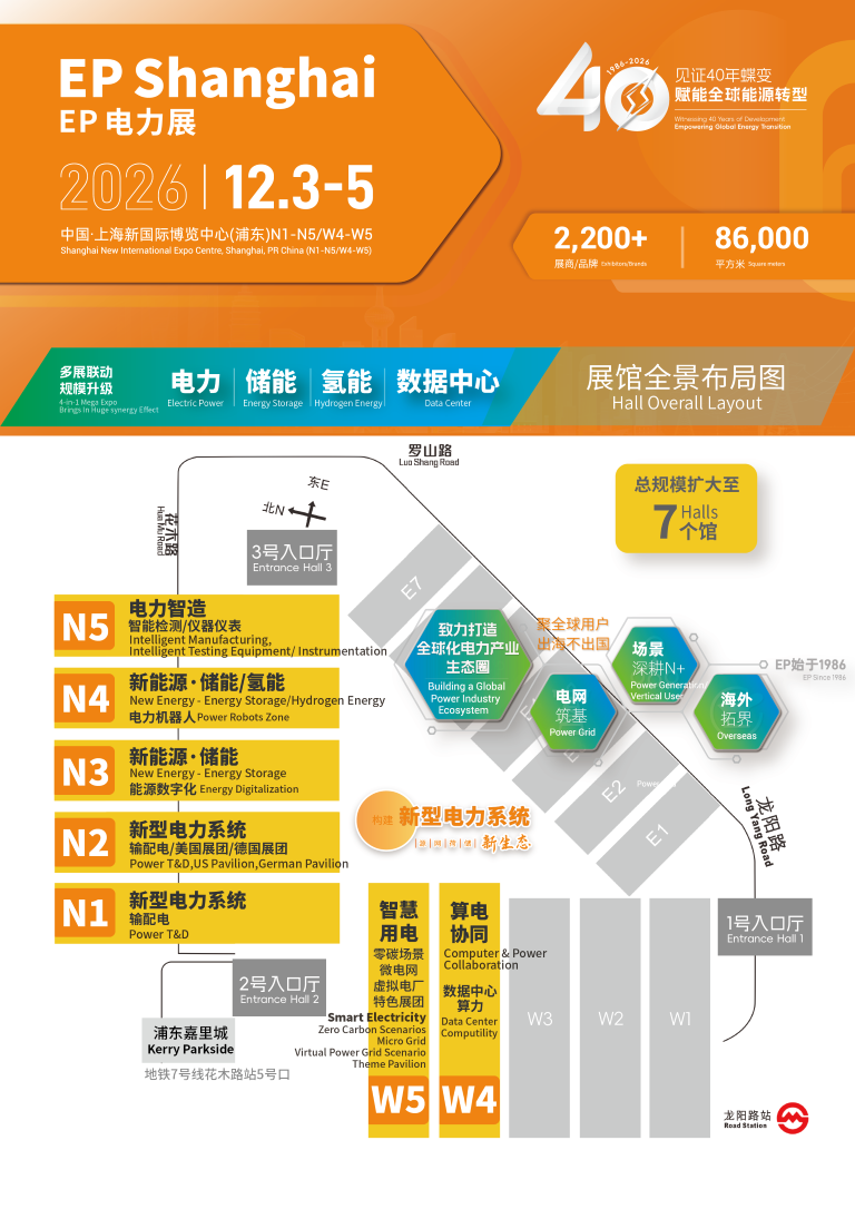 2026年是EP电力展继往开来的一年。本届展会首次启用N1至N5馆、W4馆及W5馆,共计七大展馆,展览总面积预计突破86,000平方米,这不仅标志着展会规模的再一次飞跃,更彰显了电力行业蓬勃的发展活力与市场信心。