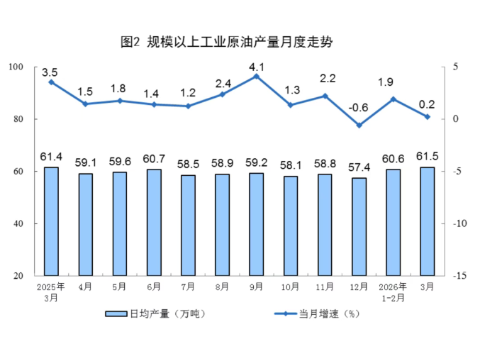原油生产保持增长。3月份,规上工业原油产量1907万吨,同比增长0.2%;日均产量61.5万吨。