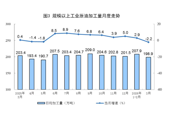 原油加工由增转降。3月份,规上工业原油加工量6167万吨,同比下降2.2%;日均加工198.9万吨。