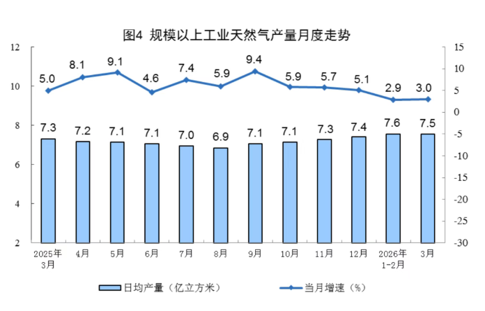 天然气生产增速加快。3月份,规上工业天然气产量234亿立方米,同比增长3.0%,增速比1—2月份加快0.1个百分点;日均产量7.5亿立方米。
