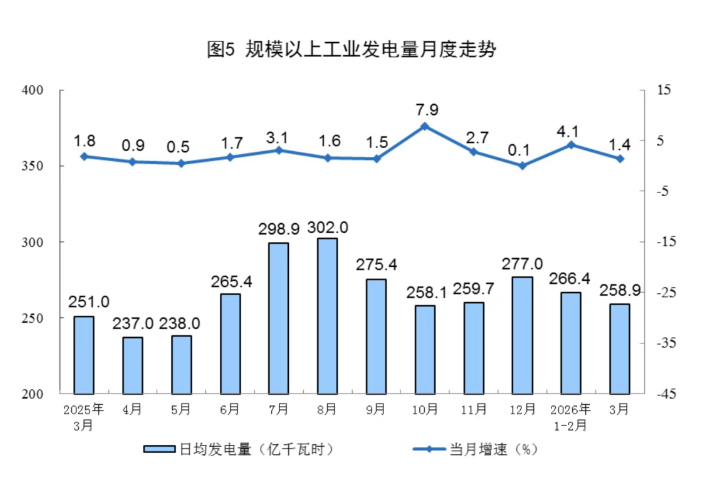 规上工业电力生产稳定增长。3月份,规上工业发电量8025亿千瓦时,同比增长1.4%,增速比1—2月份回落2.7个百分点;日均发电258.9亿千瓦时。1—3月份,规上工业发电量23782亿千瓦时,同比增长3.4%。