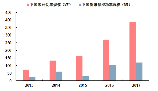 电化学储能现总体规模占比较小,但近几年发展迅猛。根据CNESA项目库的不完全统计,截止2017年底全球已投运储能项目累计装机规模为175.4GW,抽水储能占比达到96%,其次为电化学储能,占比为1.7%。虽然目前电化学储能占比较小,但却是发展速度最快的储能技术,2012~2016年全球电化学储能累计装机量复合增长率达到32%。截止2017年底全球已投运电化学储能项目累计功率规模为2926.6MW,新增规划、在建的电化学储能项目装机规模为3063.7MW;国内已投运电化学储能累计规模为389.8MW,新增规划、在建装机规模为705.3MW,预计新建项目的陆续投产将支撑电化学储能维持较高增速。