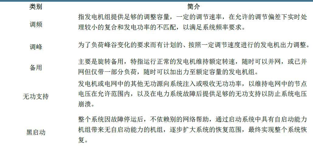 电力市场辅助服务是指为维护电力系统的安全稳定运行,保证电能质量,除正常电能生产、输送、使用外,由发电企业、电网经营企业和电力用户提供的服务。其主要内容包括:一次调频、自动发电控制(AGC)、调峰、无功调节、备用、黑启动等。其中,发电机组的一次调频、设计功率因素范围内的无功调整和机组设计调峰率以内的调峰属于无偿且必备的基本辅助服务。而有偿辅助服务指除基本辅助服务之外的其他辅助服务,包括AGC、备用、无功服务和黑启动等。