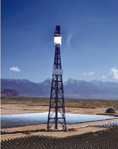 塔式太阳能热发电也称点式聚焦太阳能热发电,利用大规模的定日镜形成的定日镜场阵列,将太阳辐射反射至位于高塔顶部的吸热器,加热导热介质,经热交换后产生蒸汽,以驱动汽轮机发电。