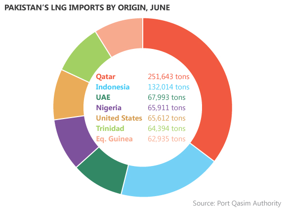 巴基斯坦6月份进口了710,500吨液化天然气,同比增长85%。这是该国液化天然气终端运营能力的第一个月。