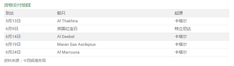 交付给EE终端的五种货物中有四种是从卡塔尔运来的,另一种是从特立尼达和多巴哥运来的,发货人被列为Gas Natural。