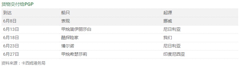 巴基斯坦于5月在旁遮普地区的Haveli Bahadur Shah和Bhikki完成了两座燃气发电厂的投产。这产生了对六种液化天然气货物的充足需求,这些货物已交付给PGP终端。位于旁遮普邦的Balloki的第三座发电厂预计将在未来几个月内启动。这将为电网增加约3.6 GW的新容量,并有助于减少停电的可能性。