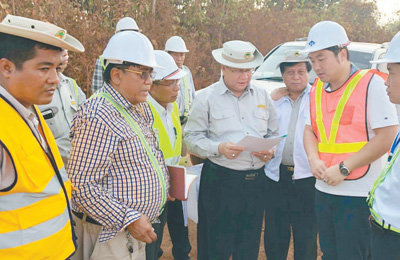 中国路桥承建的恩都—高加力公路改扩建项目是连接泰国和缅甸的重要通道,被誉为亚洲一号公路。中国路桥工程师与缅甸工程师在施工现场考察。(图片来源:中国路桥工程有限责任公司)