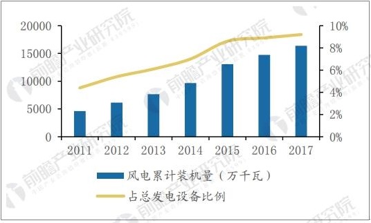 2011年-2017年风电累计装机和占比