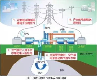以上商业电站均属于传统压缩空气储能技术(图3)。在用电低谷,压缩机将空气压缩并存于储气室中,使电能转化为空气的内能存储起来;在用电高峰,高压空气从储气室释放,进入燃烧室同燃料一起燃烧,然后驱动透平发电。