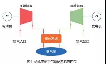 绝热式压缩空气储能技术通过储热装置回收压缩热并储存,使压缩及膨胀过程近似于绝热过程,不必燃烧化石燃料,并且能保持较高的储能密度及效率。其工作原理为:储能时,通过压缩机将空气压缩至高温高压状态后,通过储热系统将压缩热储存,空气降温并储存在储罐中。释能时,将高压空气释放,利用储存的压缩热使空气升温,由高温高压空气推动膨胀机做功发电。