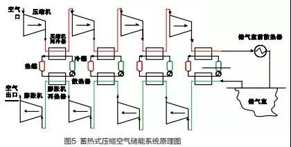 蓄热式压缩空气储能又被称作先进绝热压缩空气储能,其原理同绝热压缩空气储能类似,区别在于该系统在压缩过程级间换热及储热,绝热压缩空气储能在全部压缩过程结束后储热。相较于绝热压缩空气储能,蓄热式压缩空气储能系统的储热温度及储能密度较低,但其压缩机耗能减小,且对于压缩机材料要求不高。该系统缺点在于增加了多级换热及储热,系统初投资有所增加。