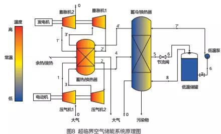 为解决传统压缩空气储能的技术瓶颈问题,近年来,国内外学者开展了新型压缩空气储能技术研发工作,包括绝热压缩空气储能、蓄热式压缩空气储能及等温压缩空气储能(不使用燃料)、液态空气储能(不使用大型储气室)、超临界压缩空气储能(不使用大型储气室、不使用燃料)等。