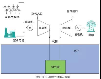水下压缩空气储能属于等压压缩空气储能的一种,该技术将压缩空气存储在水下(如海底和湖底),利用水的静压特性保持储气的压力恒定,保证压缩机出口及膨胀机入口压力恒定,从而使压缩机和膨胀机始终工作在额定工况附近,不需要通过减压阀进行压力调整,减少能量损耗,提高系统效率。该系统不需要在储气空间保持一定的最小气压,使得空气压缩能可利用比率更高。此外,该系统安全性相对较高,即使发生失效事故,造成的破坏与危害也较小。