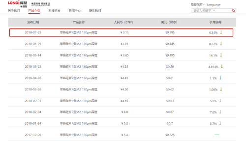 这已经是隆基年内第九次正式下调单晶硅片的价格。相比2017年末报价5.4元,截止目前,180μm厚度P型M2单晶硅片已降低71.4%。可以看到,相比上半年的平缓降价,新政过后,隆基的三次调价力度都很大,以6月14日新政后第一次调价隆基降价最为陡峭。