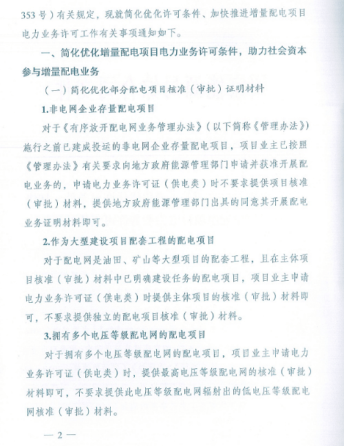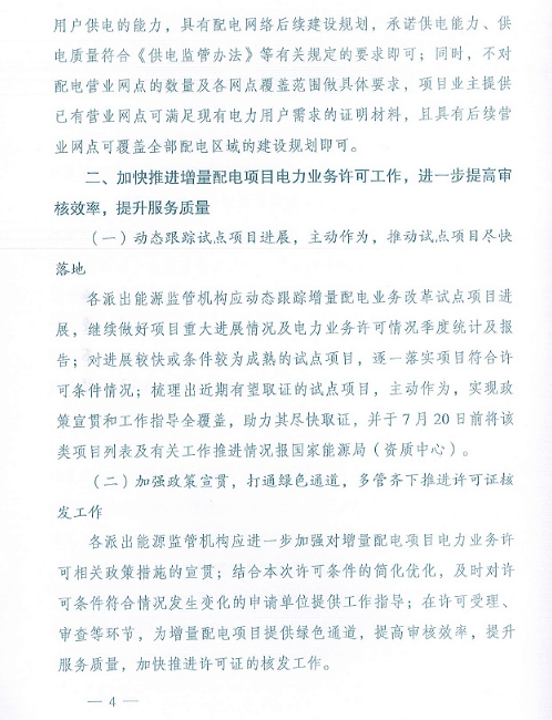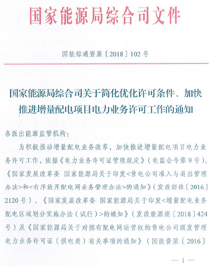7月30日,国家能源局公布关于简化优化许可条件、加快推进增量配电项目电力业务许可工作的通知指出,在简化优化配电区域证明材料方面,项目业主申请电力业务许可证(供电类)时,地方相关主管部门出具的配电区域划分意见是派出能源监管机构在许可证中载明增量配电业务配电区域的主要依据,企业间自主达成的配电区域划分协议不作为必要条件。