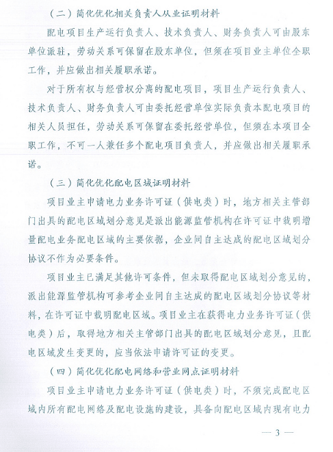 在简化优化配电网络和营业网点证明材料上,项目只要具备向配电区域内现有电力用户供电的能力,不须完成所有配电网络及配电设施的建设,也不对配电营业网点的数量及网点覆盖范围做具体要求,只要提供满足现有电力用户需求的证明材料,且后续建设能够满足规划。