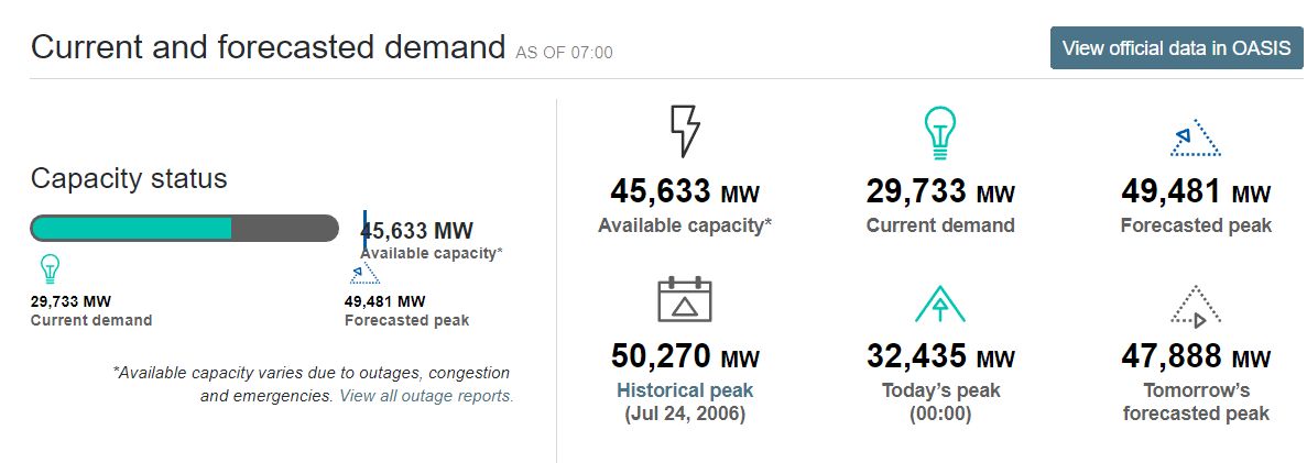 7月25日,CAISO的日前预测峰值为49,665兆瓦。该系统的可用容量为45,633兆瓦。如果不采取行动,该州正在考虑可能的停电情况。