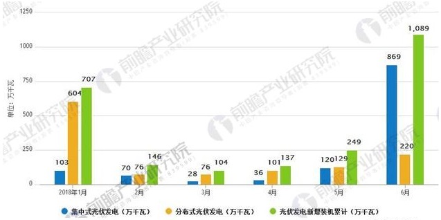 据前瞻产业研究院发布的《光伏行业投融资前景与战略分析报告》最新统计数据显示,2018年上半年光伏发电新增装机2430万千瓦,其中,光伏电站1206万千瓦,同比减少30%;分布式光伏发电新增1224万千瓦,同比增长72%。到6月底,全国光伏发电装机达到15451万千瓦,其中,光伏电站11260万千瓦,分布式光伏发电4190万千瓦。预计2018年新增光伏装机预计35GW或以上。