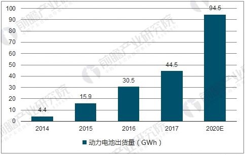受益于新能源汽车市场的高速发展,动力电池的需求得以不断提升。据前瞻产业研究院发布的《2018-2023年中国动力电池PACK行业发展前景预测与投资战略规划分析报告》数据显示,我国动力电池出货量从2014年的4.4GWh上升到2017年的44.5GWh,CAGR为116.3%,预计到2020年可达到94.5GWh,未来三年CAGR在30%左右。