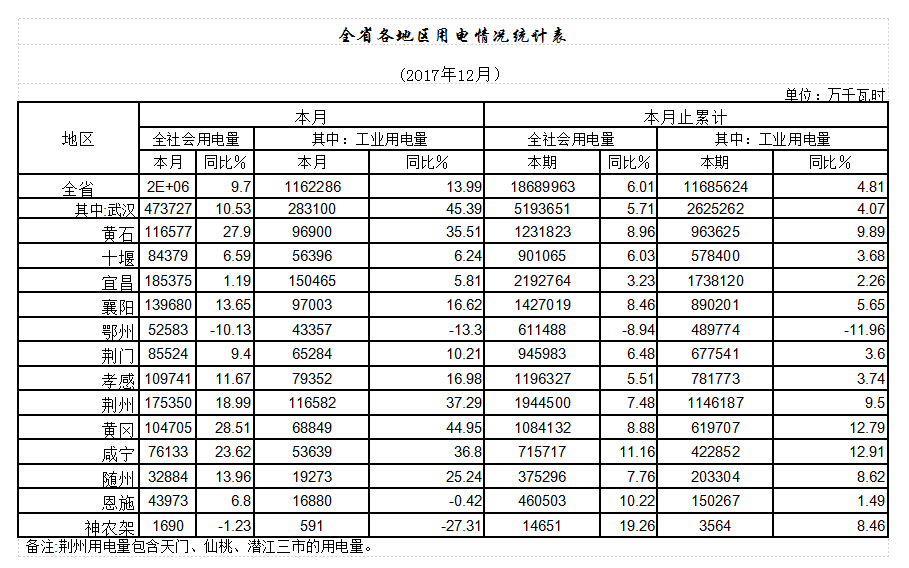 (五)全省各地区用电普遍增长,“一主两副”城市增速稳健。全省14个用电统计地区中,武汉等13个地区全社会用电同比增长,其中咸宁、恩施、神农架林区3地全社会用电增幅在两位数以上。各地工业用电基本与全社会用电同步增长,仅鄂州市受钢铁行业淘汰落后产能影响工业用电下降。“一主两副”城市武汉、宜昌、襄阳3市全社会用电量占到全省的47.16%,工业用电量占全省的44.63%,3市全社会和工业用电均增幅稳健,有力促进了全省用电的增长。