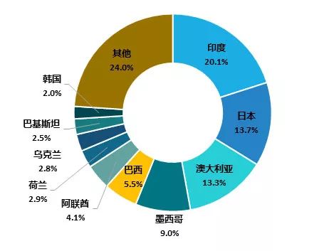 2018年上半年,我国多晶硅进口量约为6.7万吨,同比下滑4.3%。2018年1—5月电池片和组件出口总额55.13亿美元,同比增加21.2%。其中电池片出口额3.53亿美元,组件出口额51.6亿美元,组件出口量约16GW。我国2012—2016年出口额一直处于下滑态势,2017年再次实现增长,2018年1—5月继续保持增长态势,而且是在产品价格持续下滑的态势下取得的。这主要是由于中国海外的电池片、组件产能开始释放,这两个环节各有8GW的海外产能,拉动了硅片和电池片的出口,同时我国光伏企业开拓国际市场的步伐也在进一步深化。从出口区域结构来看,集中度继续降低,对出口前10名国家的出口金额占比为76%,同比下滑7.6个百分点,对澳大利亚、墨西哥、巴西、阿联酋等新兴市场出口快速增长。