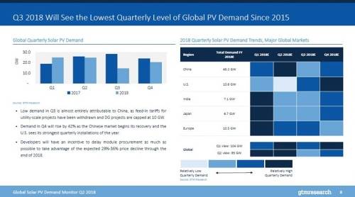 该市场研究公司指出,预计2018年中国光伏需求将从48.2GW的初始年度预测下降至28.8GW。据说中国的突然上限导致了2018年第三季度,创下2015年以来全球光伏需求的最低季度水平。
