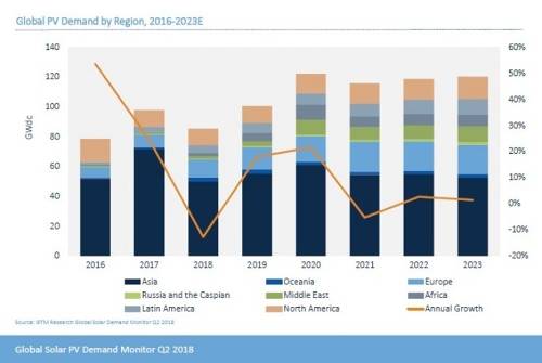 GTM Research最新的“全球太阳能需求监测报告”预计2018年全球太阳能市场将下滑至85.2GW,原因是中国决定在5月底限制其两个最大市场 - 公用事业规模和分布式发电(DG)。公用事业大幅超前计划的市场过热和补贴支付要求。