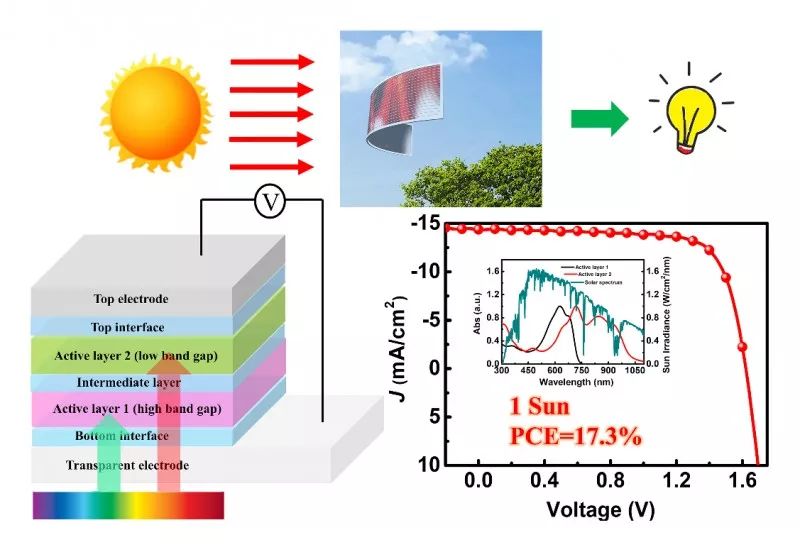 陈永胜教授团队与中科院国家纳米科学中心丁黎明教授、华南理工大学叶轩立教授研究团队合作,首先利用半经验模型,从理论上预测了有机太阳能电池实际可以达到的最高效率和理想活性层材料的参数要求。在此基础上,采用成本低廉与工业化生产兼容的溶液加工方法制备得到了高效的有机太阳能垫层器件,获得了17.3%的验证效率。