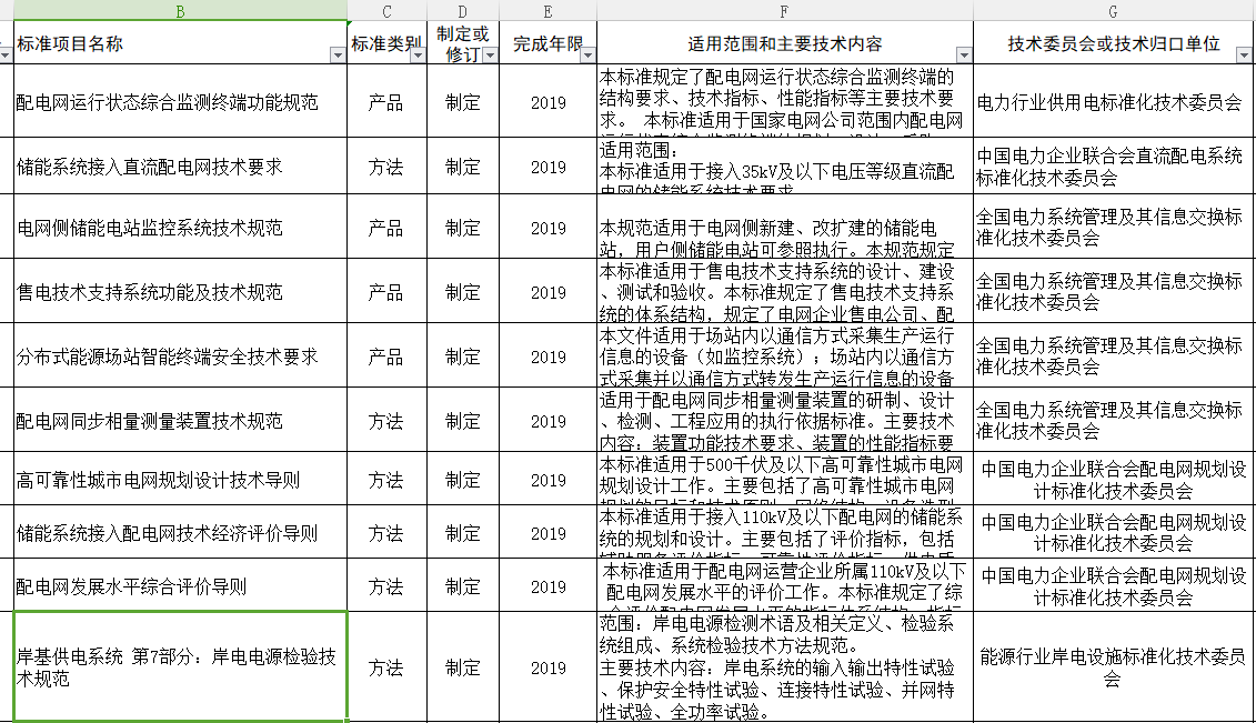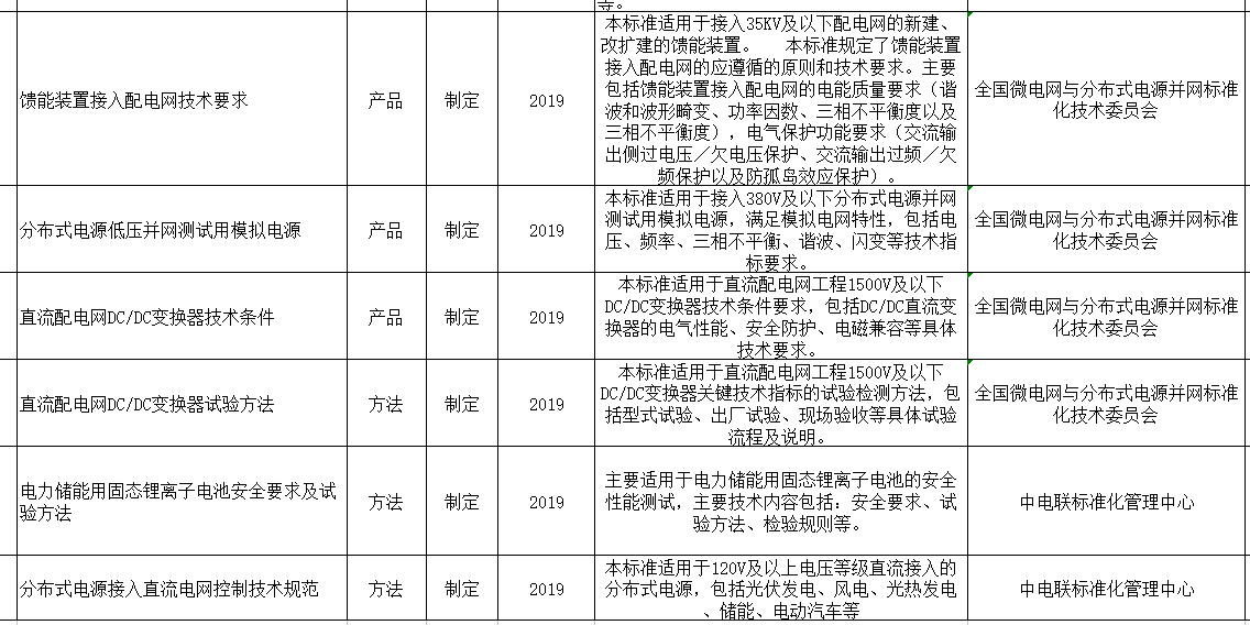 中国电力企业联合会标准化管理中心发布了关于征求中电联标准计划立项意见的函(2018年第二批),其中包含储能系统接入直流配电网技术要求、电网侧储能电站监控系统技术规范、储能系统接入配电网技术经济评价导则、电力储能用固态锂离子电池安全要求及试验方法、分布式电源接入直流电网控制技术规范等多项标准,相关条目如下: