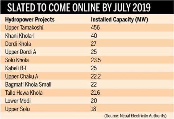 计划上线的水电站是456兆瓦上Tamakoshi,40兆瓦Khani Khola-I,27兆瓦Dordi Khola,25兆瓦上Dordi A,23.5兆瓦Solu Khola,25兆瓦Kabeli BI,22.2兆瓦上Chaku A和22兆瓦巴格马蒂科拉小,等等。