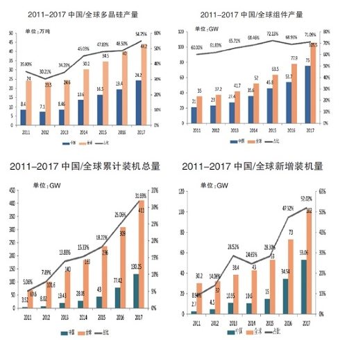 2017年,中国累计光伏装机量达到130GW,占全球累计装机量236GW的18.2% ,连续三年位居全球累计光伏装机量第一位。