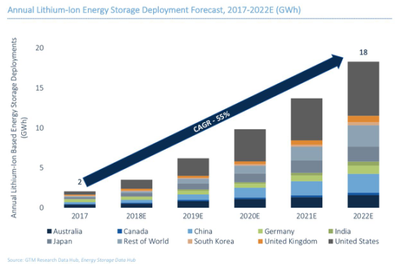 换句话说,锂离子电池储能系统将从2017年的2千兆瓦时增加到2022年的18千兆瓦时,将增长8倍以上。
