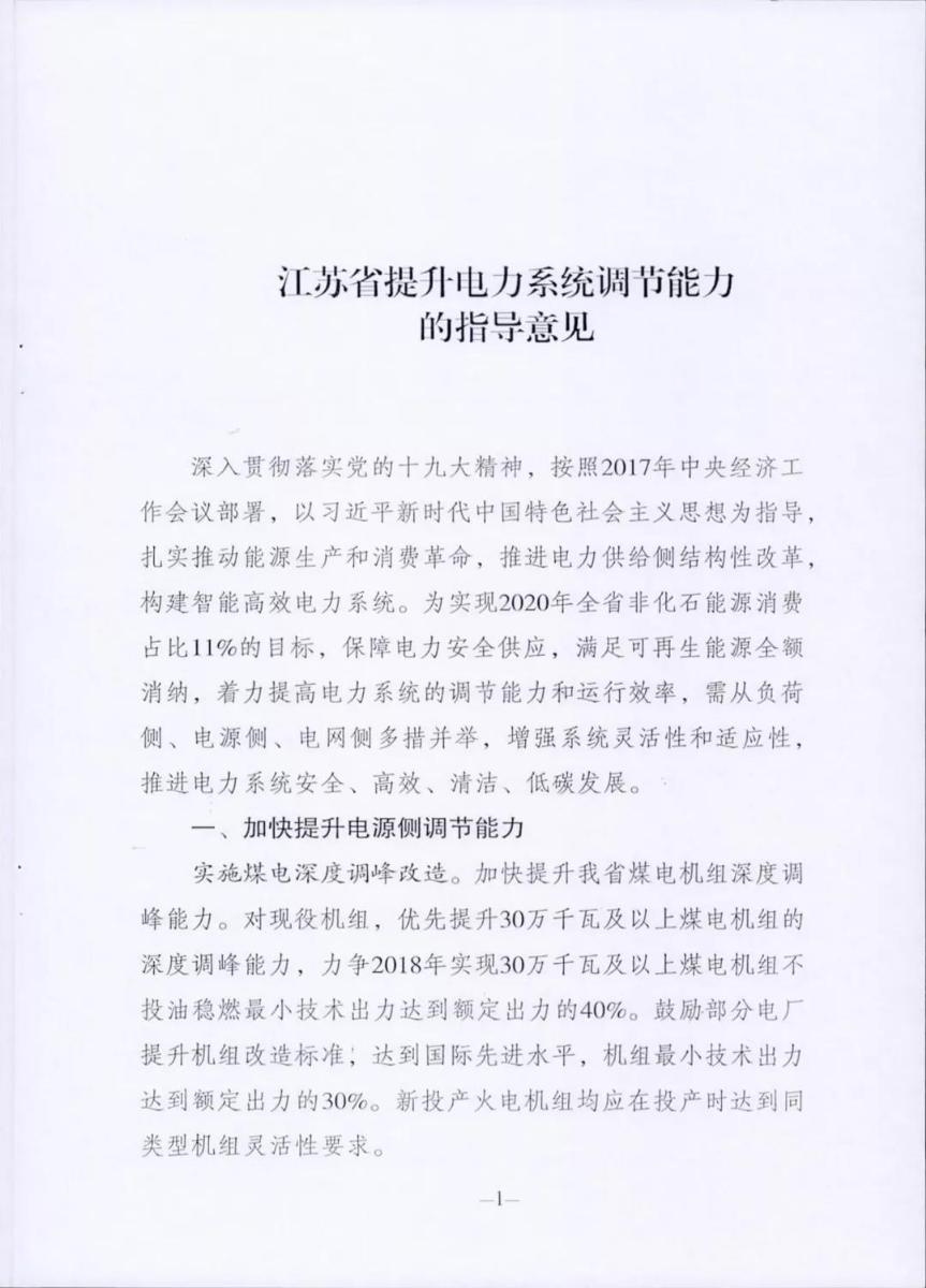 近日,国家能源局江苏监管办联合江苏省相关部门印发了《江苏省提升电力系统调节能力的指导意见》,旨在实现2020年全省非化石能源消费占比11%的目标,保障电力安全供应,满足可再生能源全额消纳,着力提高电力系统调节能力和运行效率,需从负荷侧电源侧、电网侧多措并举,增强系统灵活性与适应性,推进电力系统安全高效清洁低碳发展。