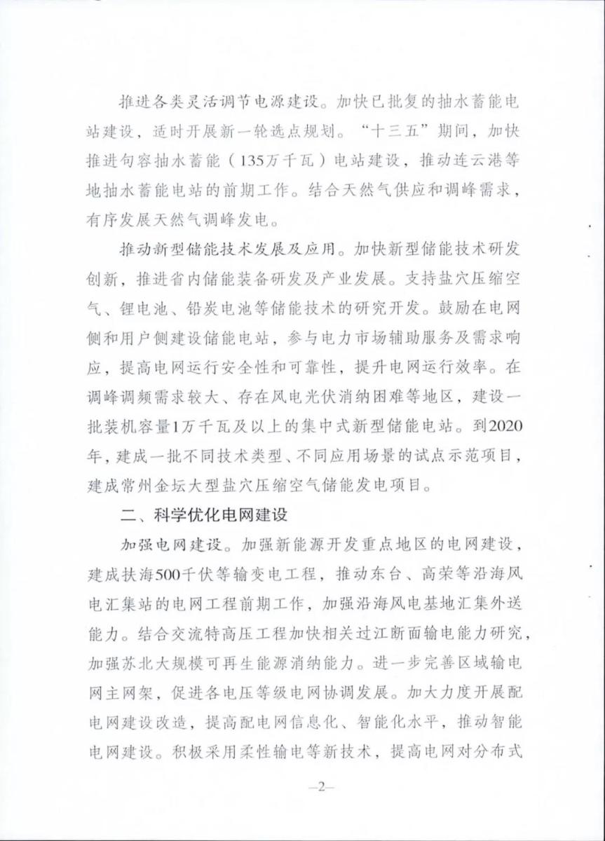 其中电源侧除了加快推进句容抽水蓄能电站建设、推动连云港等地抽水蓄能前期工作,还将推动新型储能技术发展及应用,鼓励在电网侧和用户侧建设储能电站,在调峰调频需求较大、存在风电光伏消纳困难等地区,将建设一批装机容量1万千瓦及以上的集中式新型储能电站,到2020年建成一批不同技术类型、不同应用场景的试点示范项目,建成常州金坛大型盐穴压缩空气储能发电项目。