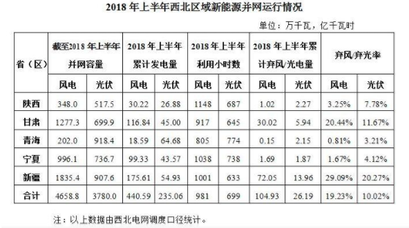 2018年上半年,西北五省(区)新增光伏发电并网容量280万千瓦,累计并网容量3780.0万千瓦,占全网总装机的15.48%;光伏发电量235.06亿千瓦时,占全网总发电量的6.34%;平均利用小时数699小时,弃光电量26.19亿千瓦时,弃光率10.02%。西北五省(区)弃光率依次为:陕西7.78%、甘肃11.67%、青海3.21%、宁夏4.12%、新疆20.27%。